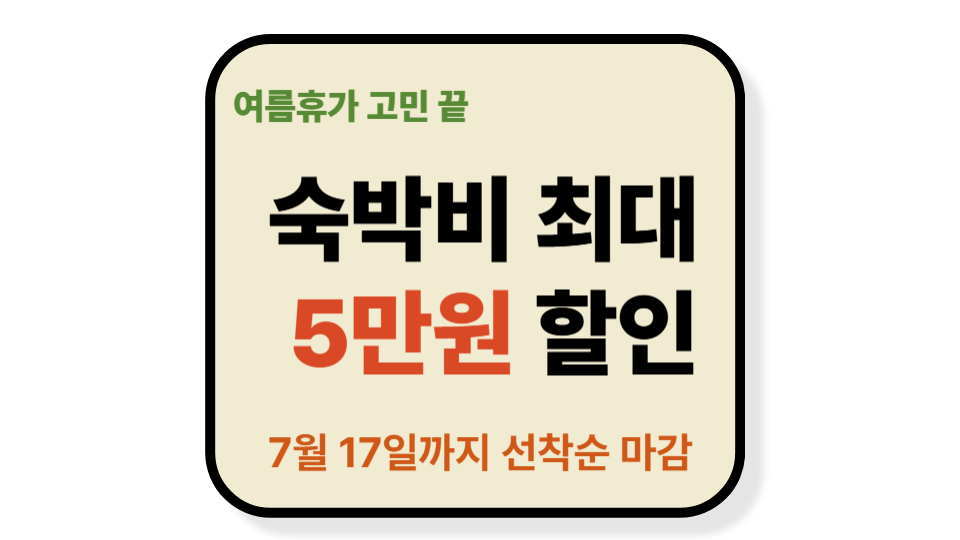 문화체육관광부에서 진행하는 **‘여름맞이 숙박세일 페스타’**가 7월 17일까지 특별 할인 혜택을 제공합니다.